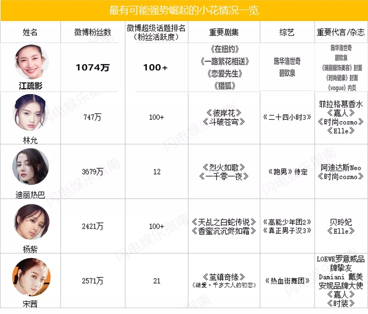 电宝从2018年待播剧和综艺的名单里梳理出了五位小花——江疏影、林允迪丽热巴、杨紫、宋茜,她们即有可能在2018年的小花卡位战中,抢得领先位置。
