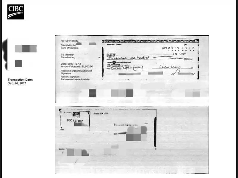 在12月13日,洪女士与CIBC持续交涉将近一个星期后,骗子前往Oakridge CIBC分行,并在洪女士新的账户里存入了两张价值$4770的支票。洪女士询问银行该骗子是如何存钱的,分行表示骗子提供了洪女士的手机号码。12月20日,洪女士接到银行通知,表示该支票遭到退回,原因是有人盗取了支票并且伪造签名存的钱,该支票持有人也是受害者。