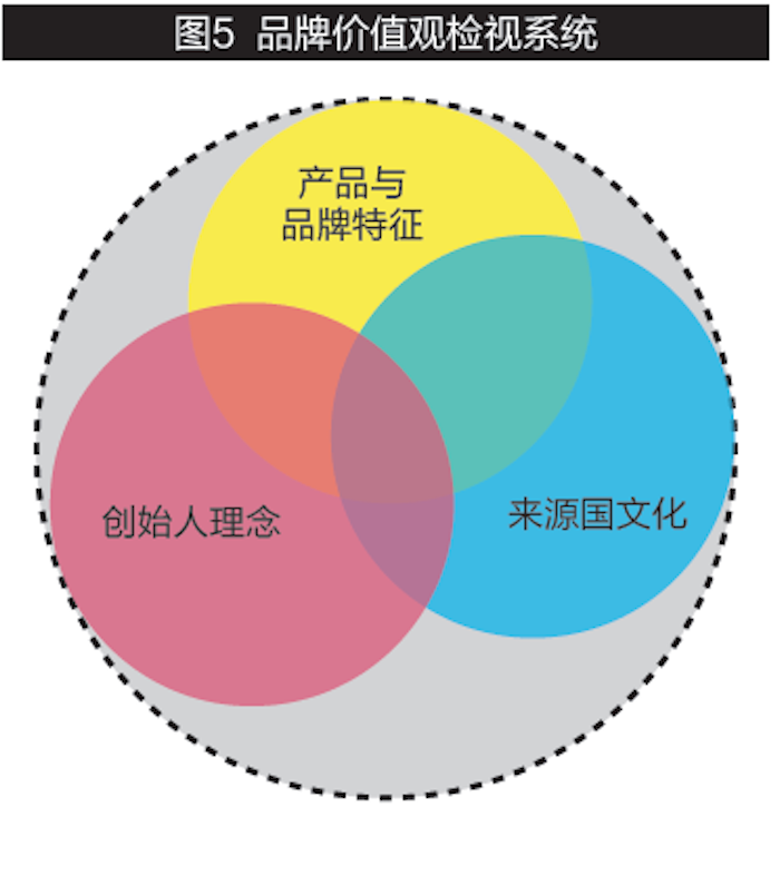 要想建立既合乎企业发展又为消费者接受的品牌价值观,可以从三个来源进行考量:产品与品牌特征、创始人理念和来源国文化;针对每一来源,企业可以依据其自身实际,识别对应的价值元素;然后再综合评估,选择确定合适的品牌价值观。对于这三个来源,两两之间可能会出现重合的情况,也可能三者之间出现重合的地方(见图5)。