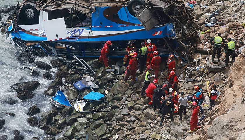 事发时接近中午,这辆大巴正载着57人开往秘鲁首都利马。在高速路上一段狭窄地段行驶时,大巴被一辆拖拉机拖车撞上,滚下斜坡。报道称,6名幸存者已被送往附近医院。