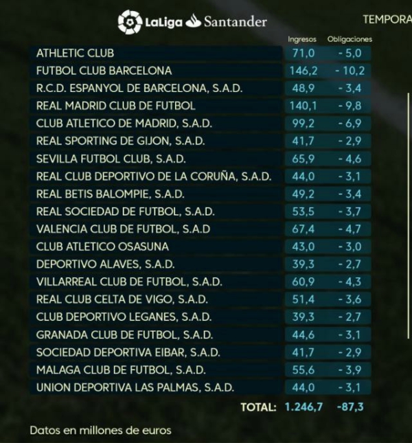 经过一系列的计算,巴塞罗那成为上赛季获得电视转播收入最多的俱乐部,为1.462亿欧元,排名第二的银河战舰获得1.401亿欧元。两大豪门占据西甲全部球队收入的近30%,同时是仅有的两支收入超1亿欧元的西甲俱乐部。