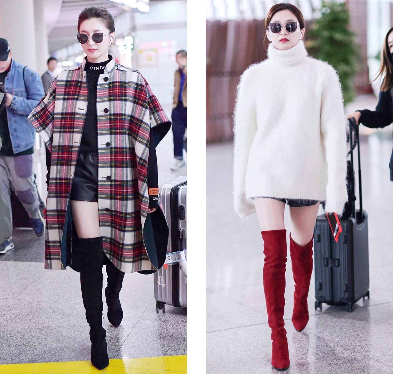 还喜欢光腿穿过膝靴,显摆大长腿~