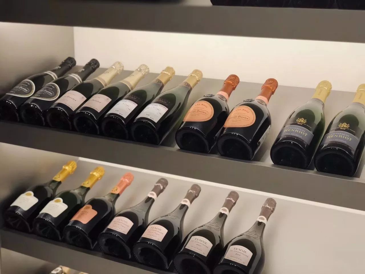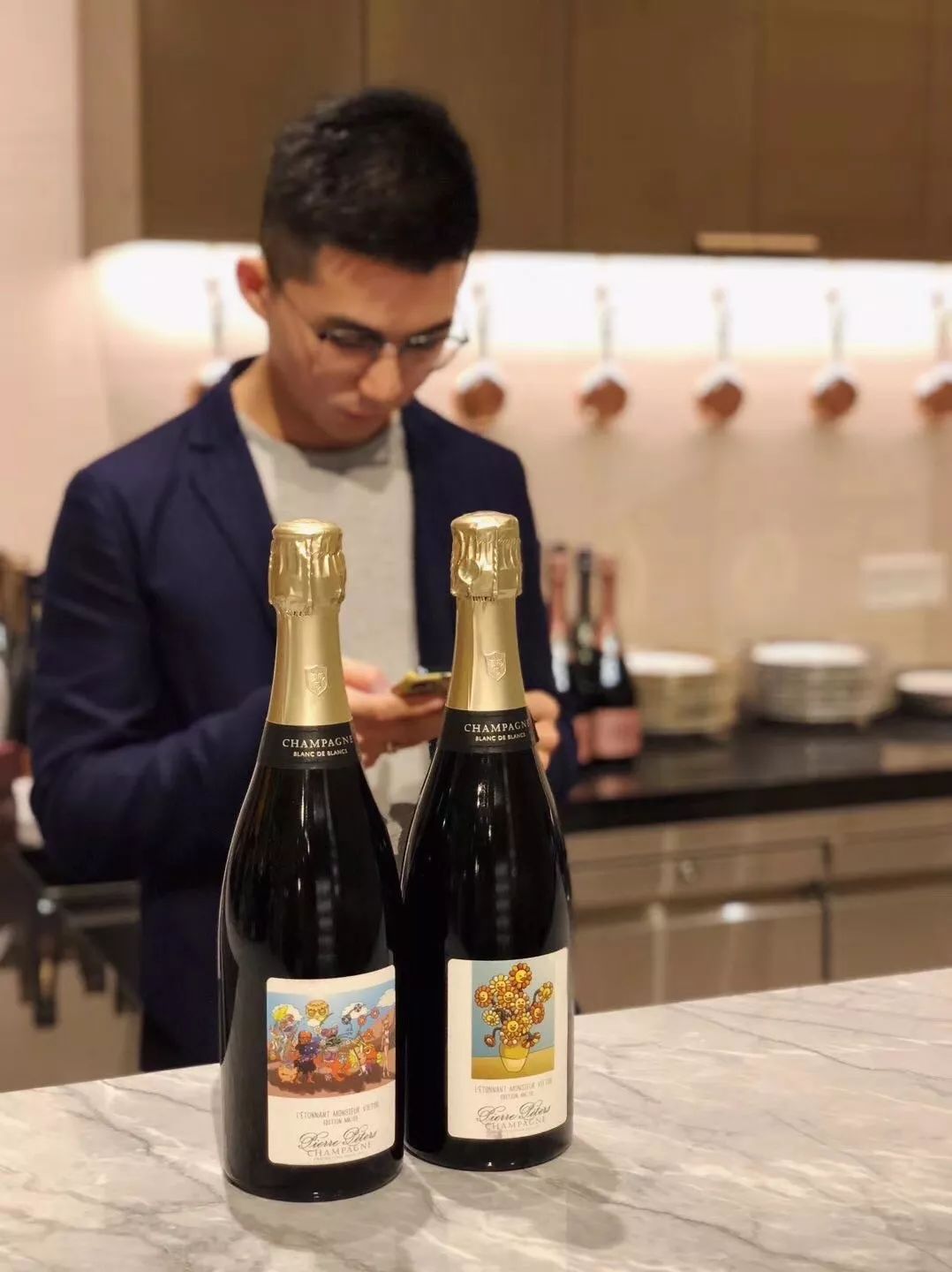 Demos最后特别隆重地介绍了新店的酒窖,他表示这次特邀了配酒师孟蕾来做选品,对这次的酒单格外自信,敢称是全世界甜品店中最大的香槟酒单。从名庄到小农,从多年份混酿到单一年份陈年香槟,更有很多市面上见不到的限量艺术款。