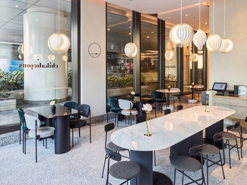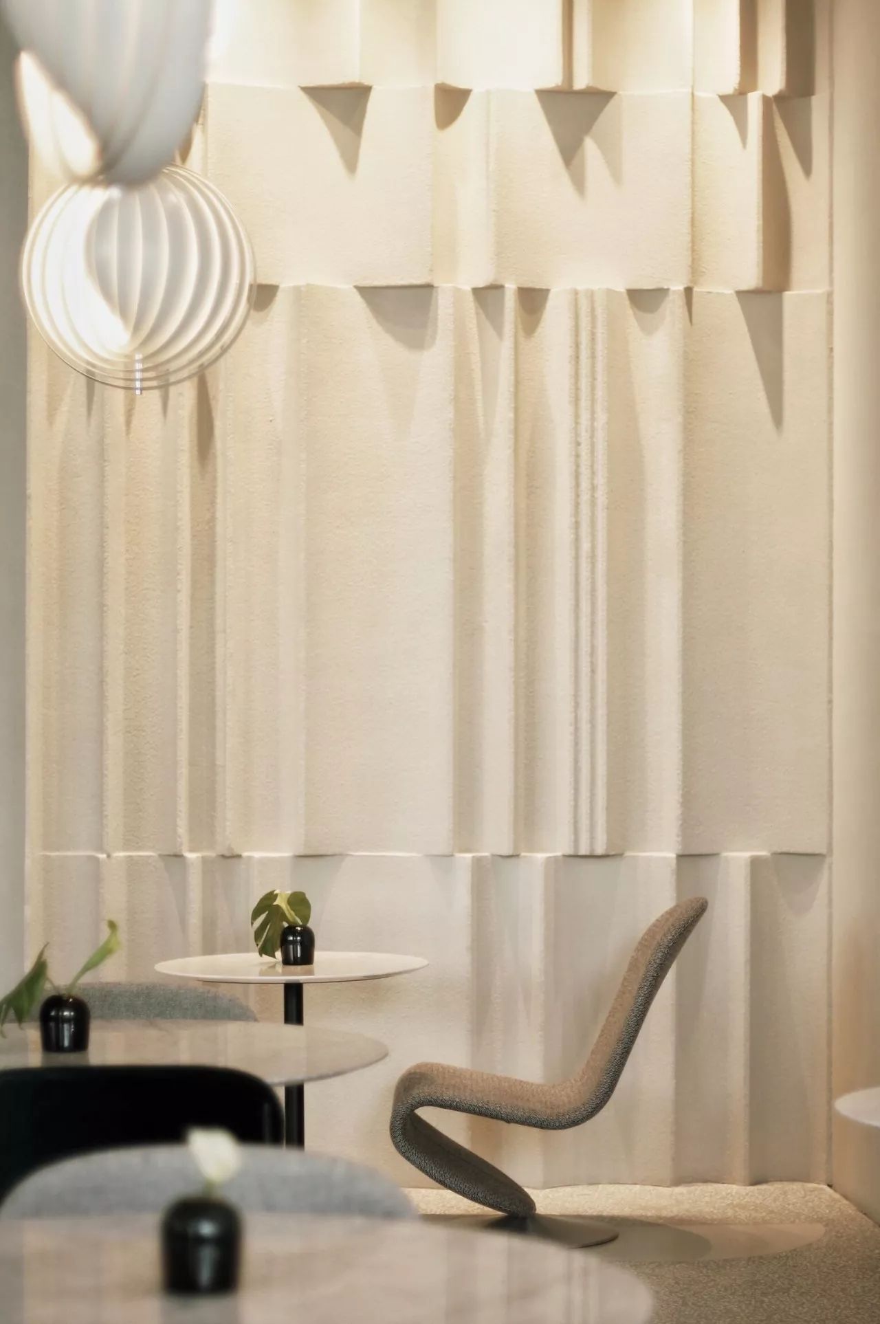 店内整体用色简单风格简约,同时配以灰色和白色水磨石制作的墙身、富有流动性的天花板和“Palladiana”石材铺法的地板来增加层次感,予人舒服轻松的感觉。