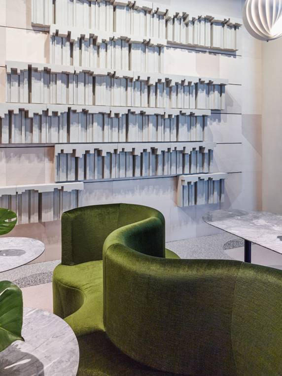“这次整个空间的选材和配色都是偏向没有突出的颜色,没有强烈的对比,我们尽量减弱这些关系,但同时保留材料之间的层次感。举例来说,我们砂岩的斜线造型,在每个‘房间’里都有应用,既是空间线索又是增加层次的一个方法。”设计师补充道。