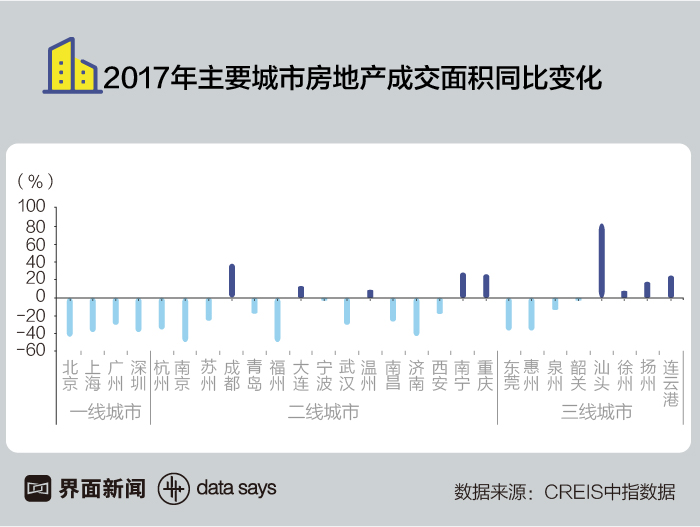 从房地产交易情况来看,调控政策的效果已经初步显现。中指院数据显示,2017年中国房地产总体成交面积同比下降16.17%,其中一线城市成交面积大幅下降37%。