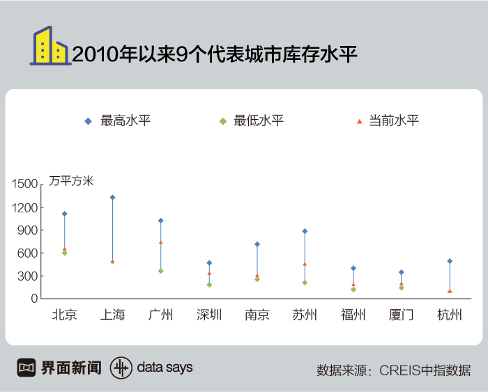在9个代表城市中,上海和杭州目前的库存面积基本处于2010年以来的最低水平,广州、深圳和苏州目前的库存面积则明显高于其近七年的最低水平。