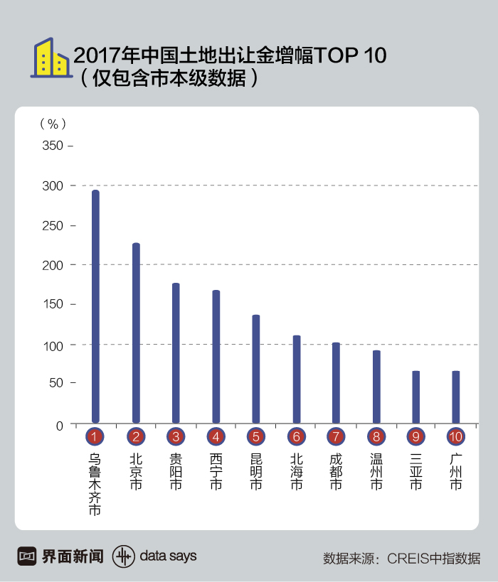 从土地出让金增幅来看,中西部城市在2017年表现突出,其中乌鲁木齐土地出让金达到291亿元,同比上涨295%。贵阳、西宁、昆明、北海和成都5个城市的土地出让金涨幅均超过100%。