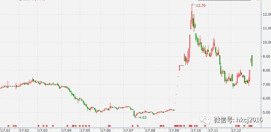 公司在2017年9月19日迎来此次上涨的第一个涨停板后,上涨“热情”则迅速高涨。公司股价在2017年9月19日至2017年10月10日这11个交易日内,上涨了117.57%,股价从21.45元上涨到48.36元。此后,公司股价经历了短期调整后,再度蓄力上涨,创下了57.5元的新高。11月下旬开始,公司股价开始大幅调整,目前维持在31元至40元的水平。