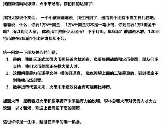 曾在德意志银行担任高管的蔡凯龙确认其加入火币网,担任首席战略官,负责集团战略和火币美国。不过,网传“月薪10个比特币,基本工资5枚,绩效工资5枚”一事,则被本人否认。他还说,该任命文件系PS任泽平的任命文件。