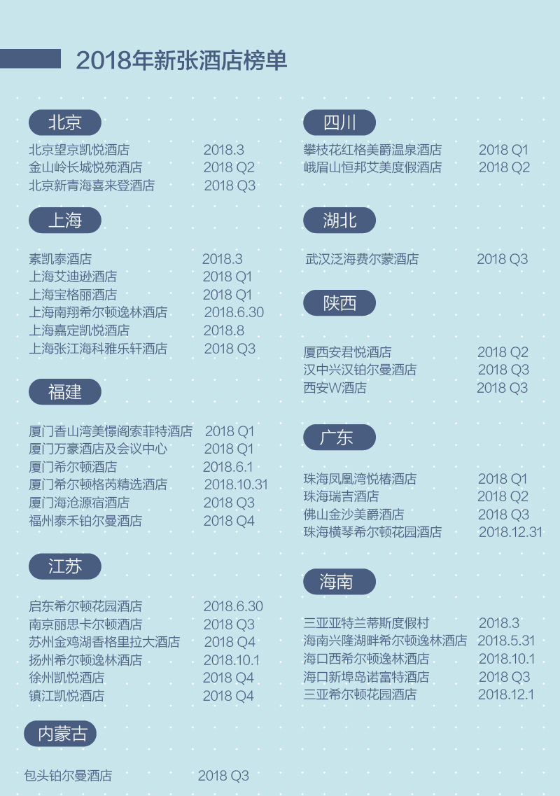 (注:榜单酒店信息来源于相关酒店集团于2017年末最新统计的开业信息,各直辖市和省区的酒店按开业时间先后顺序排列;Q1、Q2、Q3、Q4分别指代第一、二、三、四季度;各酒店最终开业以实际开业日期为准。)