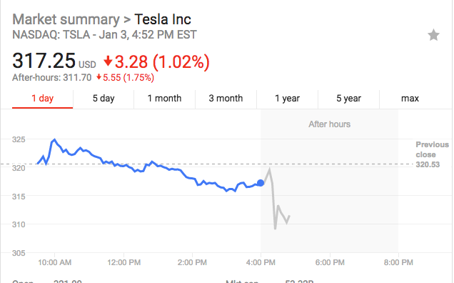 特斯拉股价今日盘后跌1.75%。