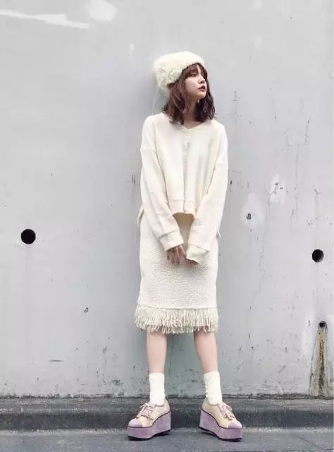 白色的毛线裙温暖且仙气质,给人一种乖乖的感觉,搭配厚底鞋超级日系。