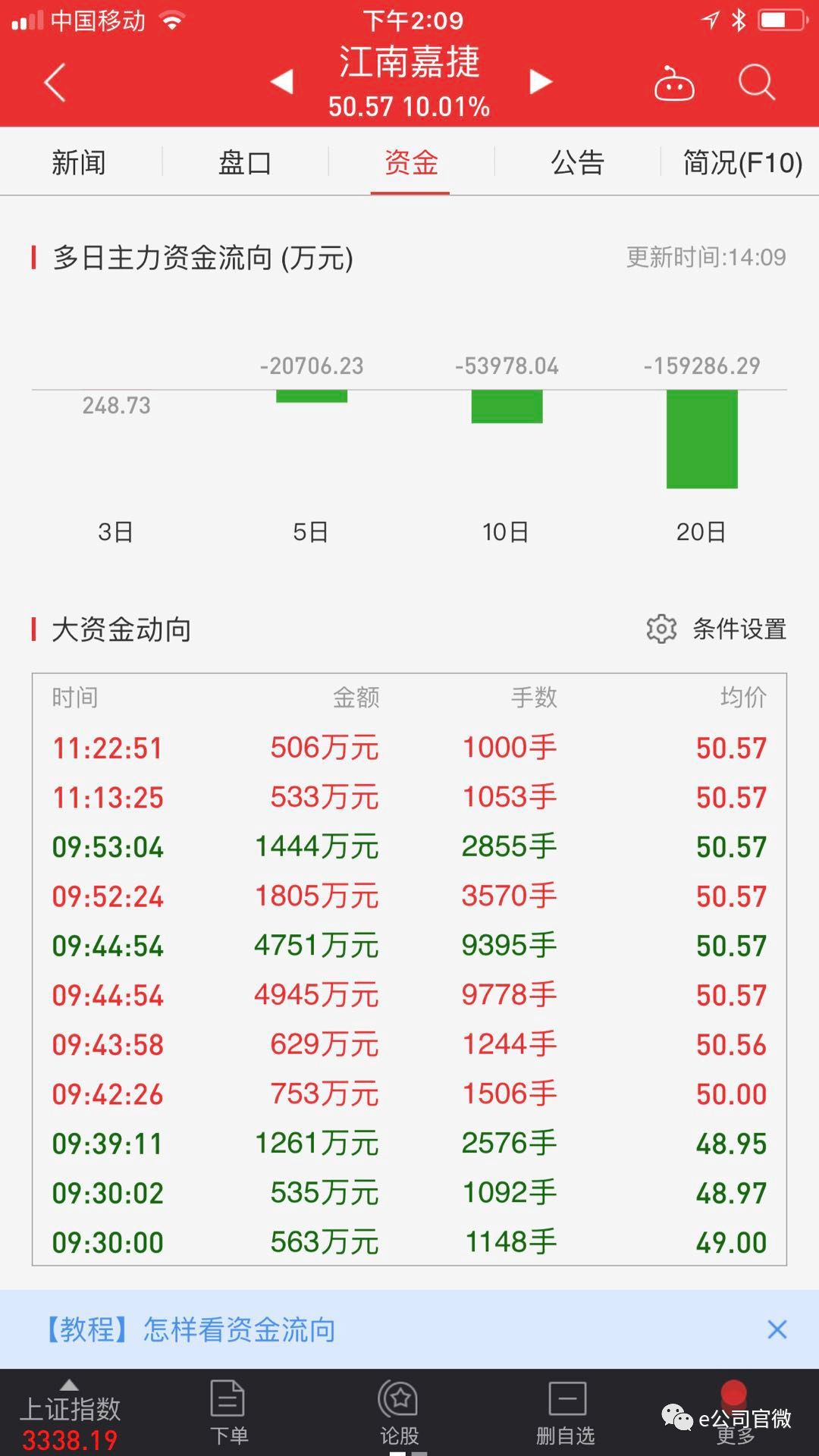 江南嘉捷复牌后虽然收获两连板,但是并未出现在龙虎榜上,所以目前并不能看到详细的大笔买卖情况。不过,通过分析江南嘉捷两个交易日的大资金动向,仍能看出一些端倪。