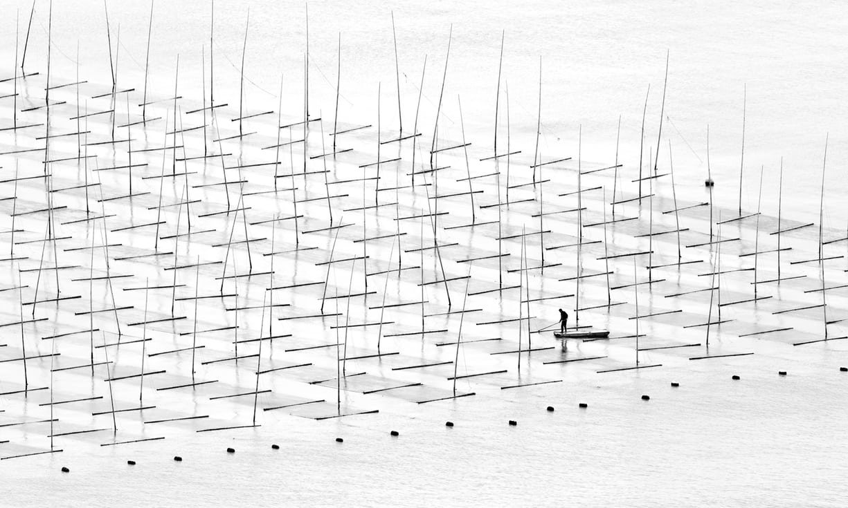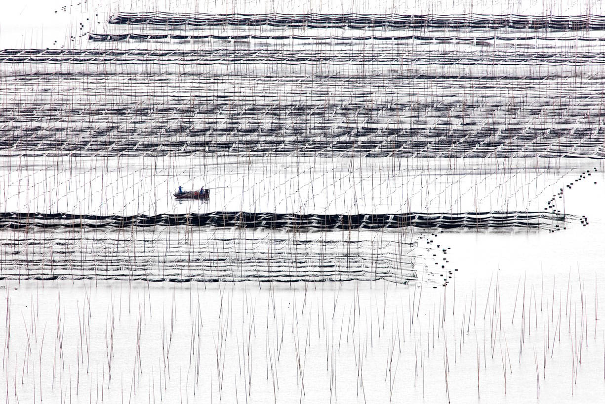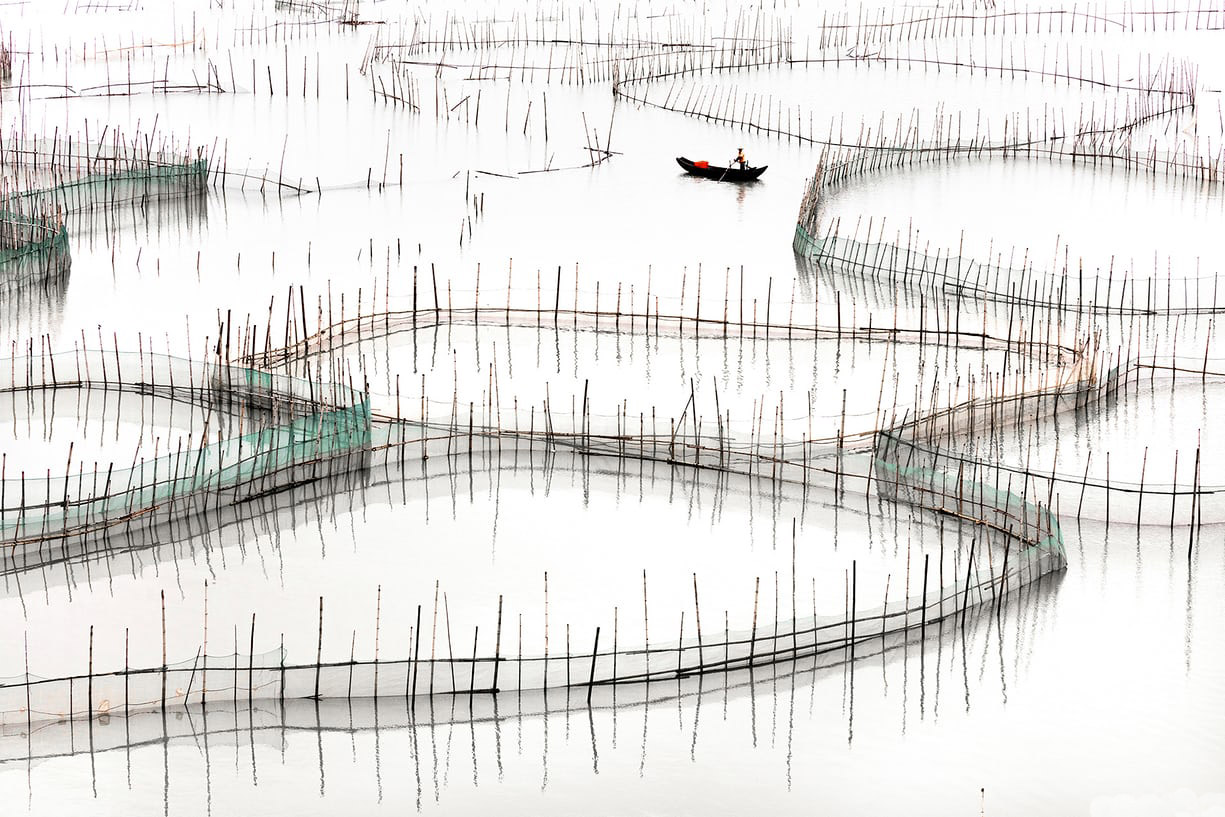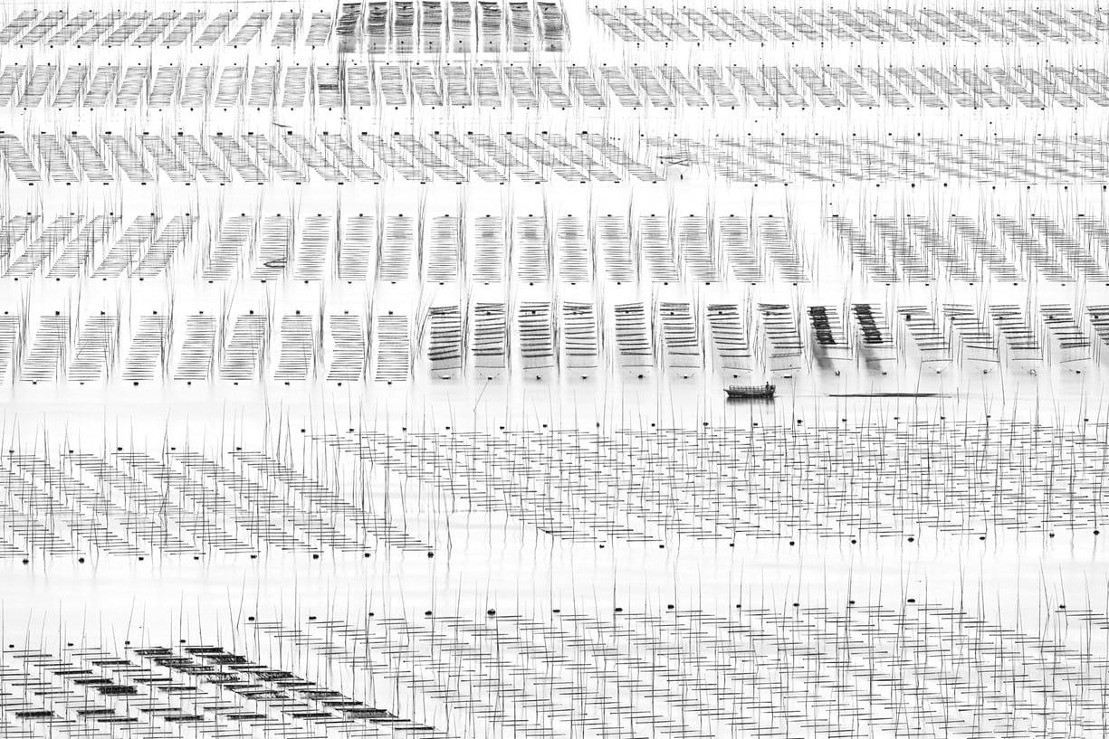 这些竹竿、渔网在某一时刻变得更加平面化、几何化,所有的物体都变成了线条,最终形成一个新的视觉结果。你甚至难以想象到这是水产养殖区。