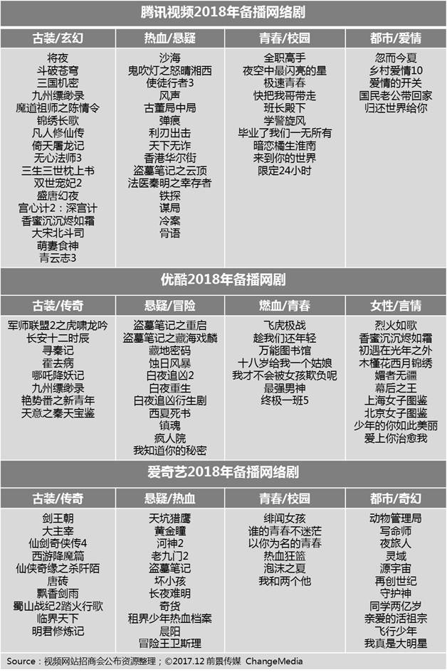 网剧已经呈现出与卫视剧相抗衡的力量,只要制作精良,即使没有流量明星,网剧也能凭着亿级播放量打造出一批流量明星,2018年也必然属于网剧井喷的年份,今天社长先来盘点一下今年的待播网剧,看看有你期待的没,先奉上三大平台的备播网剧片单——