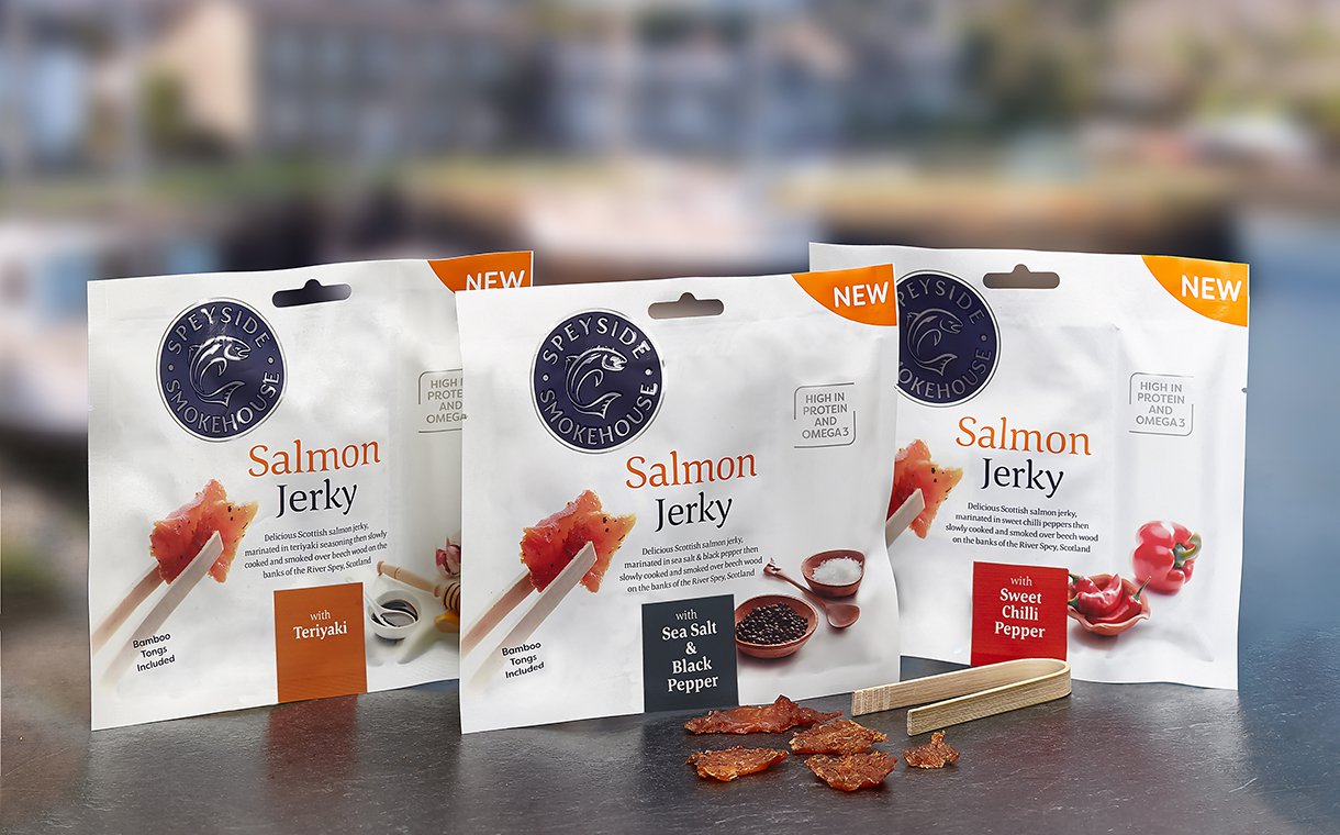 欧洲干酪生产商Meatsnacks集团已经将Speyside Smokehouse鲑鱼干加入其产品组合,有三种口味。新鲜三文鱼先进行修剪和去骨,再用豆酱、苹果醋、黑胡椒和海盐整夜腌制,然后将腌制好的鱼肉煮熟,最后在山毛榉木上熏制。这款产品omega-3、蛋白质含量高,热量低,是一款可以替代其他干肉类产品的完美零食。
