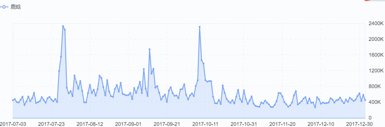 以2017年10月鹿晗公布恋情为分界点,去年的7月到10月,其微指数的平均值一直维持在一个较高的水平,经常突破800k。公布恋情之后的11-12月,微指数大幅度下跌。
