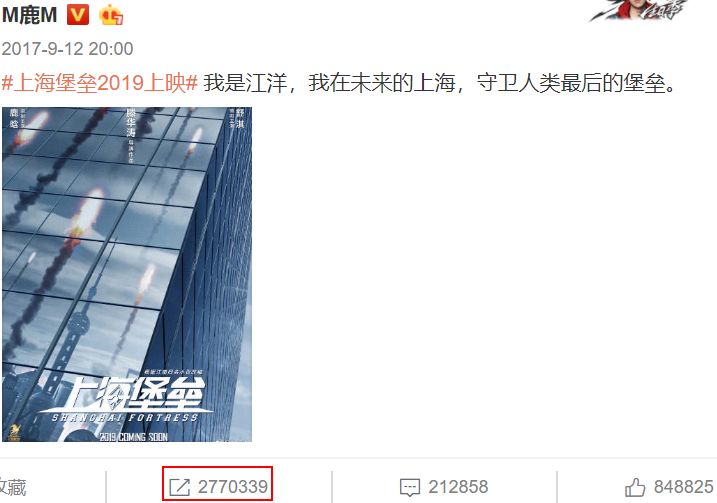 2017年9月,鹿晗共计发布微博26条,其中13条转发破50万,最多的一条有关《上海堡垒》宣传的微博转发超过200万次。