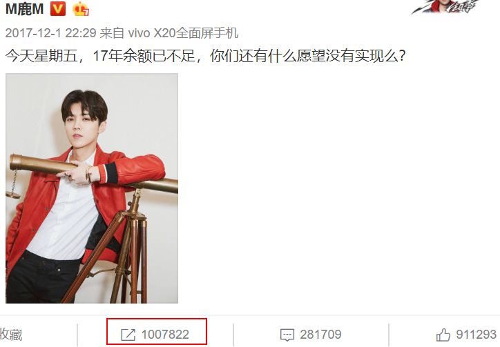 2017年12月,鹿晗发布了24条微博,转发量超过50万的有7条,转发最多的一条是鹿晗自己的一张照片,超过100万次。