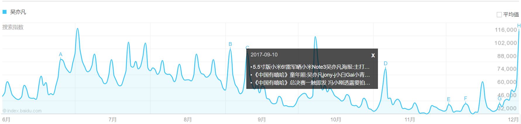 《中国有嘻哈》于去年6月底开播,7、8、9三个月是其风头正盛的时期,吴亦凡的百度指数高峰也更多地出现在这三个月,最高时接近116000。