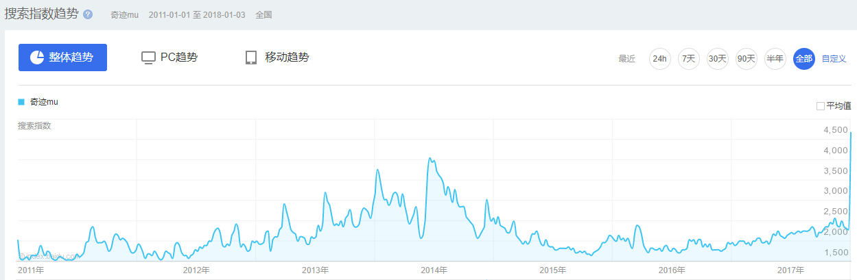 据百度指数显示,即使在“奇迹IP”产品几乎没有更新的2014年-2016年之间,“奇迹MU”搜索指数依然能够维持在1500的线上,而在2017年新品逐渐填充的过程当中,搜索指数又开始一路回暖。