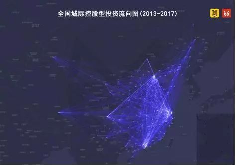 下图所采取的数据是启信宝提供的全国1.1亿家企业的全样本数据库,搜索了全国近五年(2013.1-2017.6)所有企业间的投融资信息,可作为一个参考。通过数据建立城际投资的全国城市拓扑关系网络,能够看到中国城际产业资本的控制中枢,即以“北上深”为中心的城市网络。