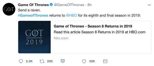 权游迷们注意了,今天凌晨HBO正式放出消息,《权力的游戏》第八季,也就是最终季,将在2019年回归,全季共有6集。