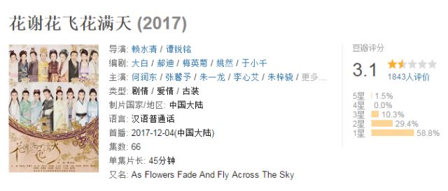 最近快要完结的连续剧《花谢花飞花满天》吸引到了娱影君的注意。网上流传着一种说法:“如果说今年最烂的现代剧是《极光之恋》,那么最烂古装剧当属《花谢花飞花满天》了。”本剧的豆瓣评分仅有3.1分,共计1843人评价,其中一星占比高达58.8%。