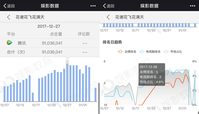 娱影连续剧系统显示,本剧今日还排在了电视剧网络点击量日榜的第二名。自12月5日上线以来,32天累计点击量突破了20亿,日均点击量为6356万。