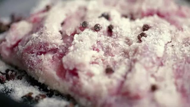 2.冷却后,将买回的羔羊肉用花椒盐抹匀,静置半小时;