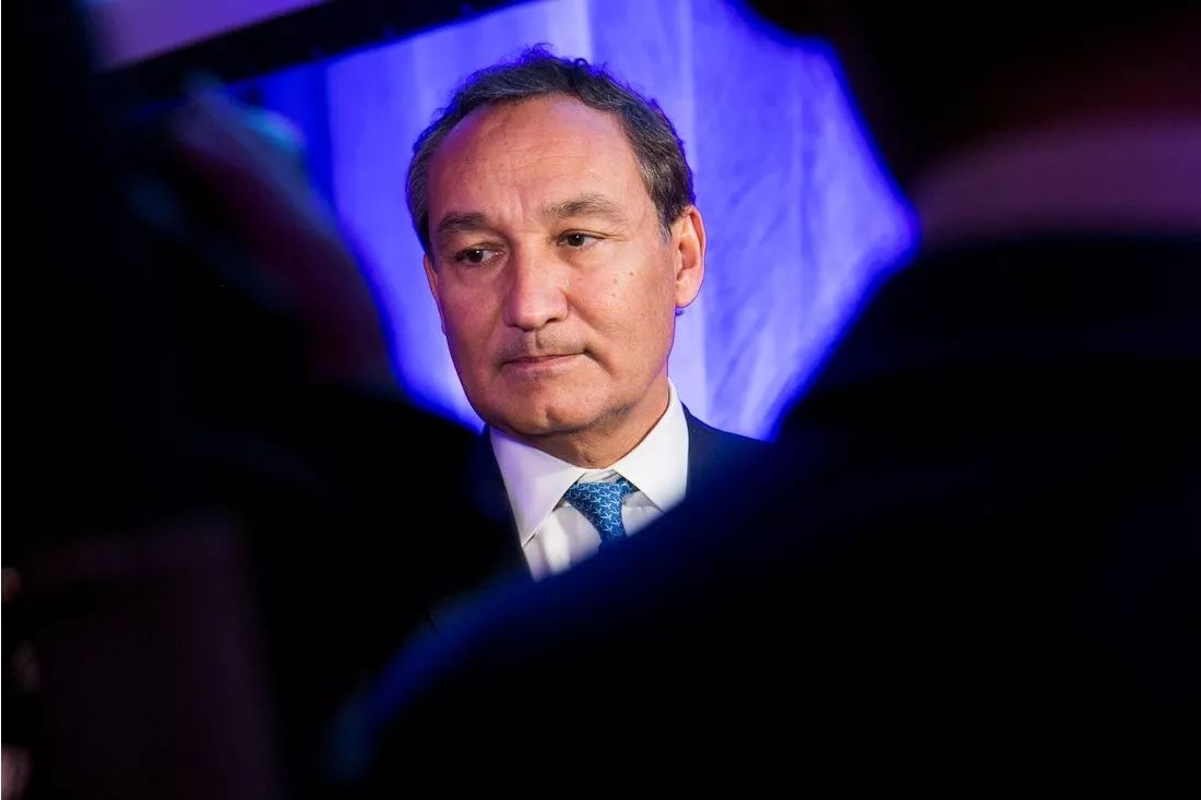 2017年3月2日,美国商务部在华盛顿特区举办的2017航空峰会上,美联航首席执行官奥斯卡·穆尼奥斯发表演讲。Kristoffer Tripplaar — Sipa USA via AP