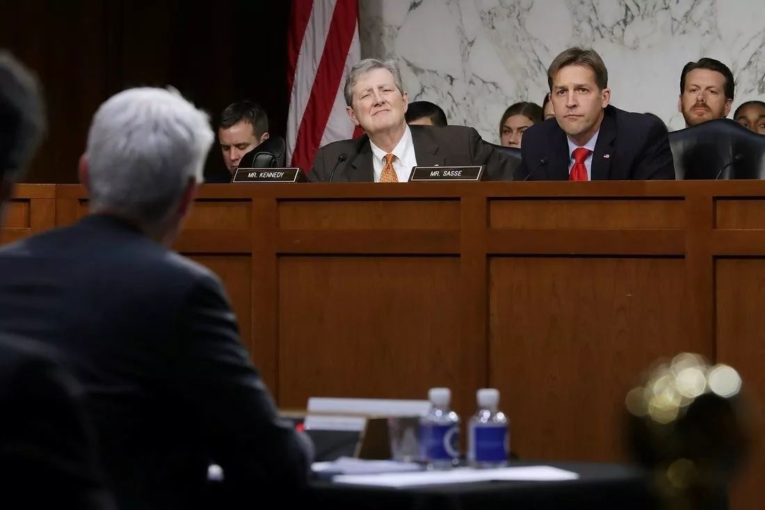 2017年10月31日在华盛顿特区美国国会哈特参议院办公楼里,犯罪和恐怖主义小组委员会上,参议院司法委员会成员,约翰·肯尼迪参议员(路易斯安那州)(中间)和本·萨斯(内布拉斯加州)(右)听取谷歌、Facebook和Twitter的证人陈述。Chip Somodevilla/Getty Images