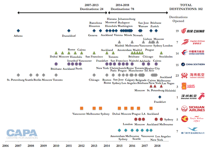 根据亚太航空研究中心(CAPA)的数据,2007年-2013年,中国航空公司开通的洲际航线是24条,但是在2014年到2018年,短短五年时间,中国航空公司开通的洲际航线数量达到78个,数量翻了两番多。不仅三大航在加快国际市场布局,包括海航旗下的天津航空和祥鹏航空,四川航空、厦门航空这样的中型航空公司也都想分一杯羹。