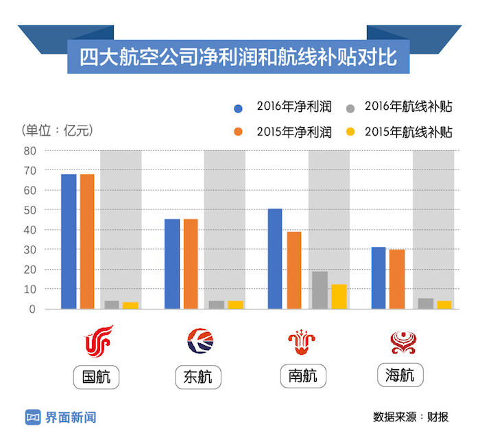 2016年,包括海航在内的四大航空公司的净利润总和达到195.15亿元,比2015年同比增长7.1%,但是这些利润当中,航线补贴就高达32.13亿元,比2015年同比上涨31.3%,换句话说,这些上市公司漂亮的财报背后是一部分并没有搭乘国际航班的纳税人交给政府的税费被用于扶持这些航空公司走向国际,这也是航线补贴一个颇具争议的点。
