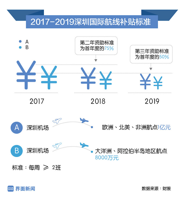 根据界面新闻记者获得的一份深圳市政府2016年年底通过的关于航线补贴的文件,其中规定,若航空公司开通以深圳机场为出境地,定期直航洲际和阿拉伯半岛地区客运新航点,持续运营时间满一年,且期内每周出港航班达到2班(含)以上,首年资助标准为:至大洋洲、阿拉伯半岛地区航点8000万元;至欧洲、北美、非洲航点1亿元。第二年资助标准为首年度的75%,第三年资助标准为首年度的50%。该政策从2017年开始生效。