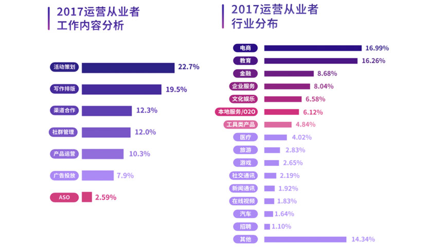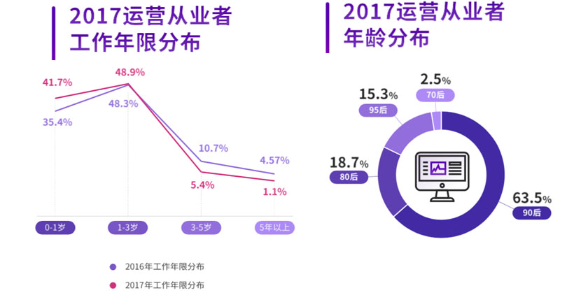 2004年之前互联网起步阶段,线上世界大片空白等着从业者和投资人用创新概念去探索;在那之后随着线上产品越来越多,竞争之中用户对产品的体验成为关注重点。如今成熟产品和业务流程越来越同质化,运营和服务的价值凸显出来。就这样越来越多的运营需求出现了。2017年84.7%的运营人从业年限不超过三年,69%的从业者基于兴趣和行业趋势的判断而选择这个岗位。