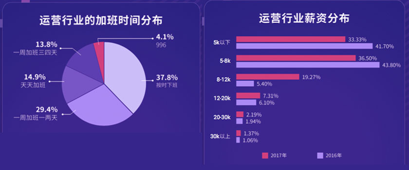 加班问题在2017年有所好转,但运营岗位依然是重灾区。2016年运营行业81.4%的人忍受加班困扰,到2017年这个数字下降到62.19%。幸好老板没有因为看到大家都在加班而把它当作常态。不过值得注意的是2017年仍然有14.9%的从业者几乎每天加班,甚至有4.1%的人在依照996的制度运转。