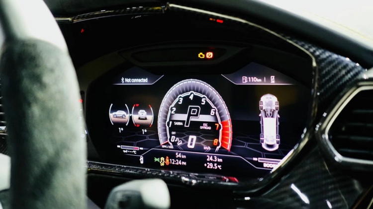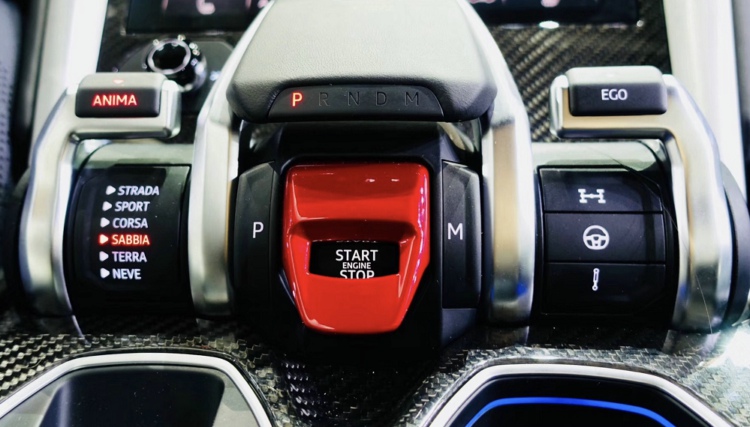 被高档皮质和Alcantara材质包裹的三幅式运动方向盘除了拥有绝佳的视觉效果外还有着顶级的手感,中控点火按键上的“红盖头”同样延续了兰博基尼的传统,让每一次启动车辆都充满了仪式感。