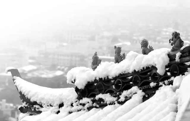 秋日的红叶还未散尽,冬日的白雪已洒满了屋顶。