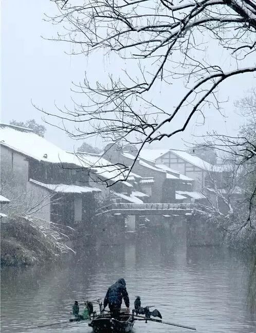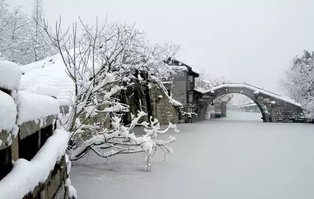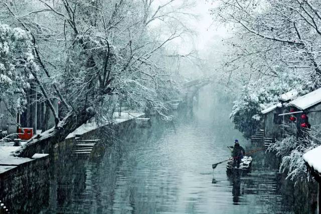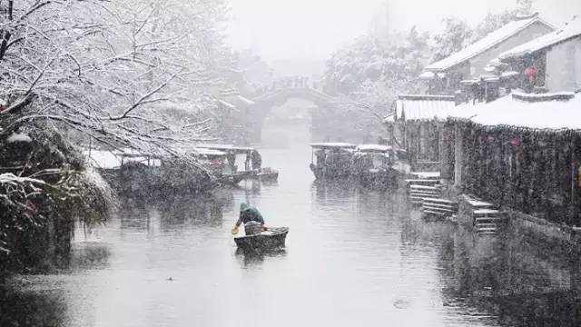 撑起一把小伞,站在高桥上,看披着白雪的乌篷船往来不歇,小桥流水人家也是一派银装素裹模样。