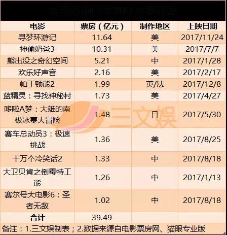 再来看进口动画电影,2017年的票房为36.37亿元,占据了国内电影票房的7成,仅《寻梦环游记》就贡献了23.32%的票房。