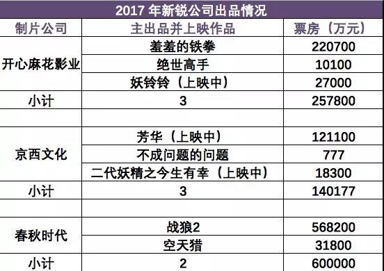 说起效率,2017中恐怕还有一家比开心麻花影业效率更高的公司——春秋时代影业。这家在2017年出品电影累计达60亿的公司,其实只出品了《战狼2》和《空天猎》两部影片。春秋时代并不是电影界的新兵,有了2017对军事题材影片的成功探索,也许这正是春秋时代转型的一个契机。