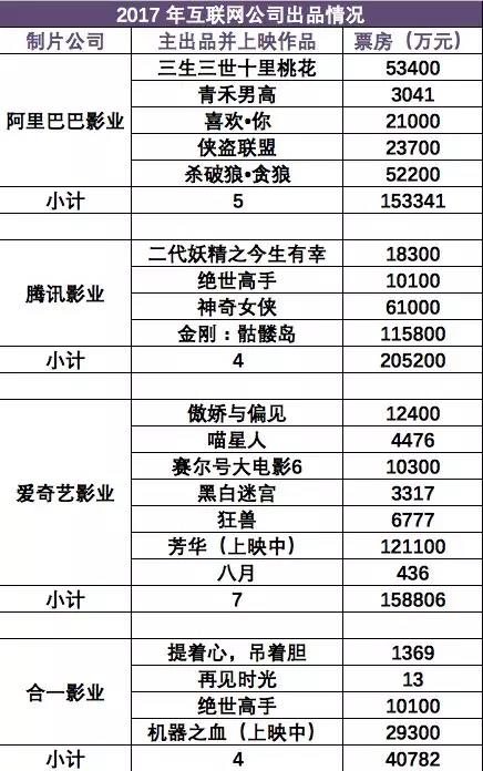 自2015年,以“BAT”为代表的互联网企业纷纷涉足电影行业后,经过近两年的发展,互联网电影公司同样成为2017年制片队伍中一股不容忽视的力量;以微影、猫眼、淘票票为代表的线上售票平台,在这一年中也更加深入地参与到上游制片之中。