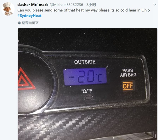 周日当天,悉尼各地的网友纷纷在Twitter上晒出了当地的温度,还有来自美国俄亥俄州的网友乱入,希望悉尼能分点热度给零下20摄氏度的俄亥俄。