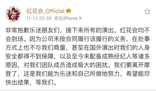 除了小众圈子,他的性格也注定不适合公司化运营——2017年,11月13日晚8点38分,红花会发表官方声明,宣布退出摩登天空旗下厂牌MDSK,半小时后,MDSK厂牌也通过官微回应,以好聚好散的语气确认此事。至此,红花会和摩登天空的合作算是画上句号。