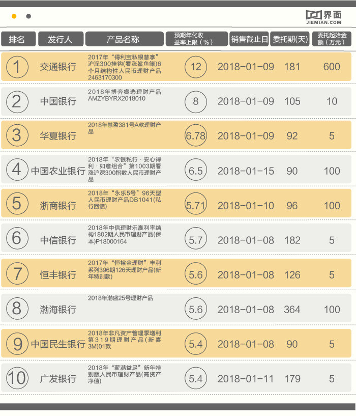 来看看本周有哪些可以挑选的银行理财产品,本周,18家国有商业银行和股份制商业银行全国范围发售针对个人的人民币理财产品255只,界面新闻从每家筛选了收益率最高、最值得关注的理财产品,共10只。