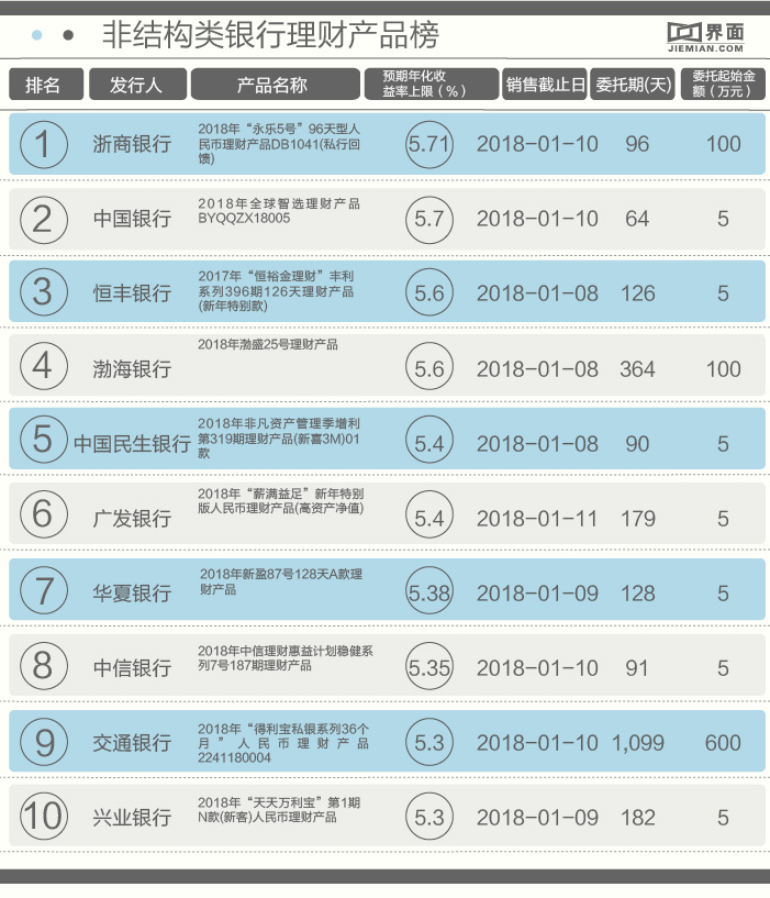 考虑到投资者的拟投资金额、风险偏好不同,本期还对起点为5万元的银行理财产品以及抛去结构化产品收益复杂设置、收益相对稳定的非结构类理财产品进行筛选,做成榜单,供投资者参考。