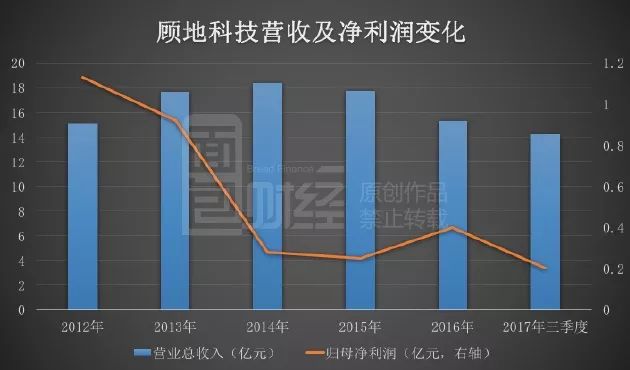 上市之后的第一个完整年度——2013年,顾地科技就出现了业绩变脸,其营业收入为17.64亿元,同比增加16.87%;归母净利润为0.92亿元,同比下降18.43%。随后几年,净利润持续下滑,到2015年时,归母净利润仅为0.25亿元,处于亏损边缘。