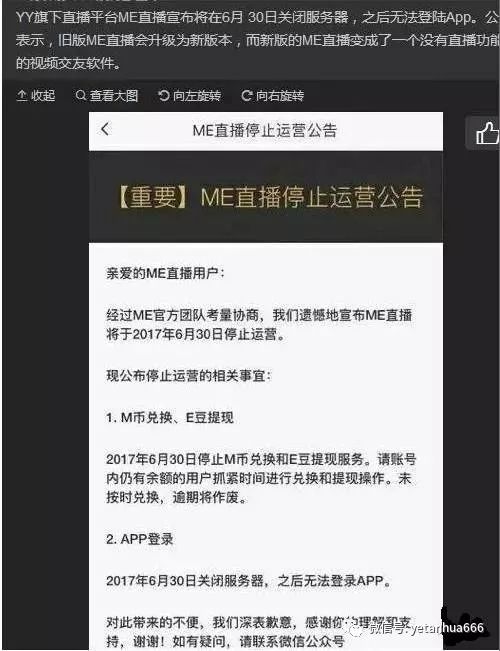 2016年上线的Me直播不光曾有鹿晗等多位人气明星入驻引流,而且有上市公司YY的强大资金支撑。但对盈利模式单一的、仍然烧钱为营的直播平台而言,即使手握10亿资金,也不够支撑平台延续生存。由于运营不善,最终导致Me直播巨额亏损。2017年6月,Me直播运营团队宣布停止运营。Me直播被业界看作是有背景的直播平台里死的最早的。